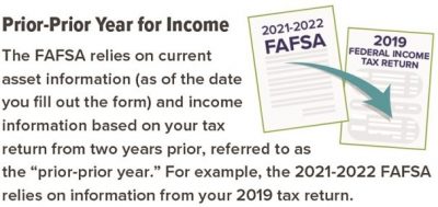 Amid the pandemic, annual income projections for some families may now look very different than they did two years ago based on “prior-prior year” income (see graphic). Families who have lost jobs or received cuts in income may qualify for more aid than the FAFSA first calculated.